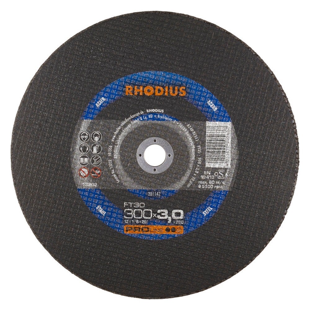 Ce disque de tronçonnage contient du corindon de qualité (oxyde d’aluminium) et deux couches de tissu en fibres de verre. Conformément à la norme EN 12413 et aux exigences de l’oSA, la charge latérale minimale pour le disque de tronçonnage s'élève à 40 N, voire 50 N pour les diamètres supérieurs à 150 mm. La date limite d’utilisation (trois ans) est indiquée sur la bague percée. Des contrôles intensifs réalisés tout au long du processus de production permettent de garantir une qualité constante. Tous les mille disques, un disque est par ailleurs soumis à un test destructif afin d’offrir une sécurité maximale. Il s’agit ici d'un disque de forme droite (forme 41). Les disques de tronçonnage de forme droite permettent une profondeur de pénétration supérieure et donc également plus de coupes.